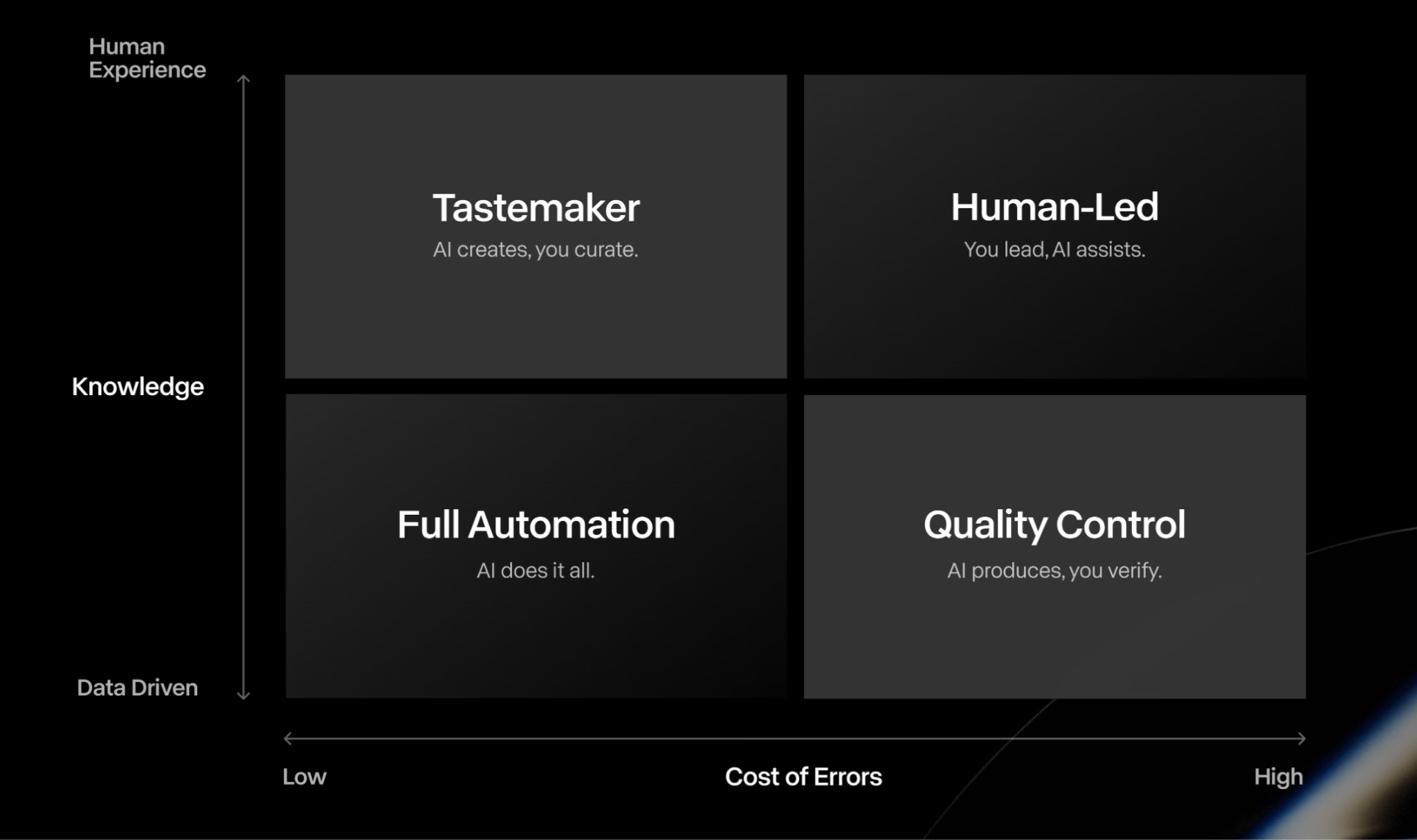 One axis is the knowledge required: is it data-driven, or does it demand human experience? The other axis is the cost of getting it wrong. Together, they tell you whether AI should own the task, support it, or stay in the background.